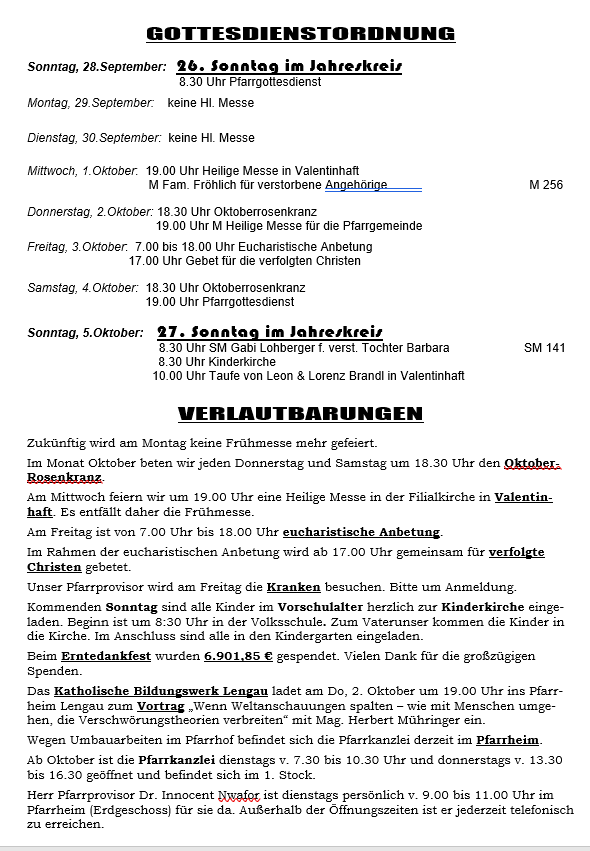 Pfarrkanzlei Die Pfarrkanzlei befindet sich ab 1. Oktober wegen Umbauarbeiten des Pfarrhofes im 1. Stock des Pfarrheimes (Munderfing 58) Öffnungszeiten: Dienstag: 07.30 - 10.30 Uhr Donnerstag: 13.30 - 16.30 Uhr Tel.: 0670 / 1998858 Herr Pfarrprovisor Dr. Innocent Nwafor ist jeden Dienstag v. 09.00- 11.00 Uhr persönlich für Sie im Pfarrheim (Erdgeschoss) da. Gerne steht er Ihnen auch jederzeit unter der Nr. 0676 / 87765479 zur Verfügung.